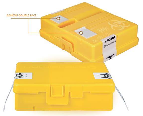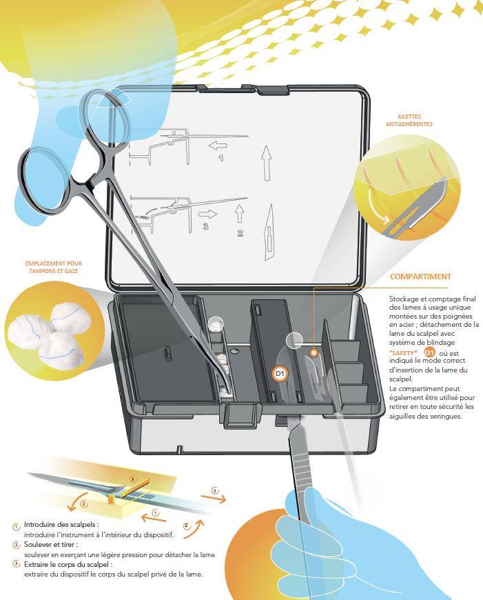 • de 2 compartiments pour le stockage des aiguilles et des lames de bistouris (scalpels)